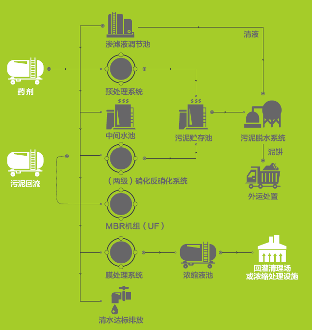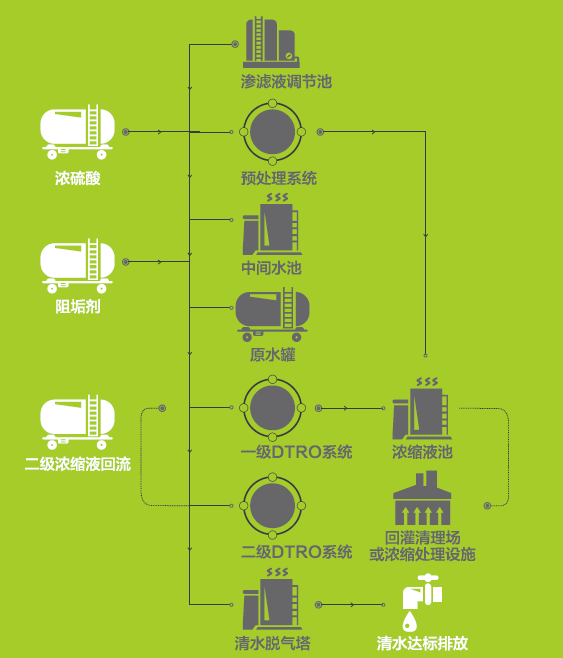 采用高压DTRO膜分离工艺及MVR蒸发工艺,均为行业领先工艺,彻底解决垃圾渗滤液浓缩液处理的难题,从而实现垃圾渗滤液处理近零排放的目标。