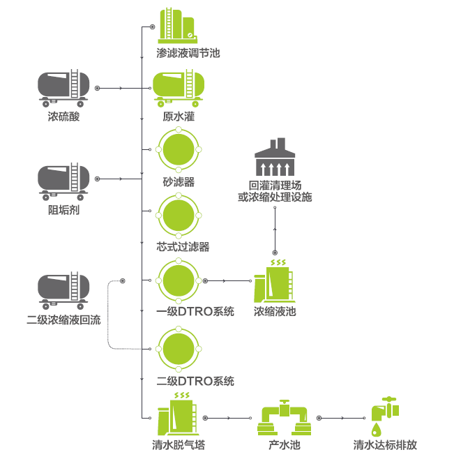 采用高压DTRO膜分离工艺及MVR蒸发工艺,均为行业领先工艺,彻底解决垃圾渗滤液浓缩液处理的难题,从而实现垃圾渗滤液处理近零排放的目标。